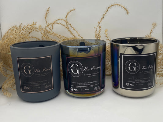 The masculine requires maintenance and wellness. Too often, we fail to pamper and pay attention to the wellness of the masculine in our lives. This collection is centered around "HIS" wellness and peace of mind. Relaxing candles which tantalize the soft, sexy, bold, strong and peaceful nature of the masculine in our lives. Add this collection to your/his selfcare regimen.